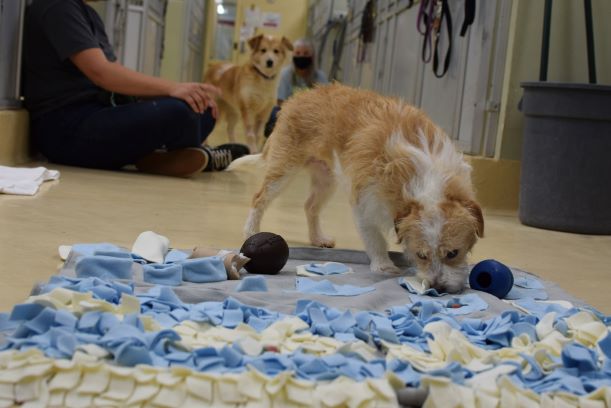 Food can be a great motivator and tool to help animals overcome their fears. The dogs in the BMod program at OHS use snuffle mats, frozen water bowls, kongs, puzzle toys and other materials to engage a pet’s brain and reward them with food. Food can be incorporated into any activity and allows pets to forage and practice natural behaviors. Anything involving food or mealtime can become an enrichment experience.