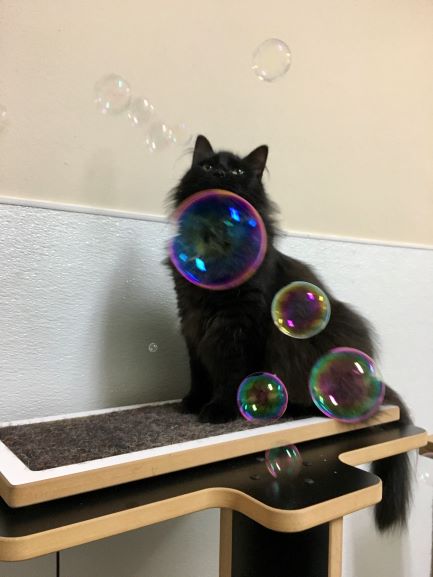 Sensory enrichment includes anything that engages a pet’s sense of smell, sight, touch, and smell. Audio books and bacon bubbles fall under this category as a soothing voice and floating bubbles can help calm a fearful pet and help build their resilience. Behavior specialists in the BMod program at OHS also use a variety of scents to infuse a sense of calm into the shelter environment.
