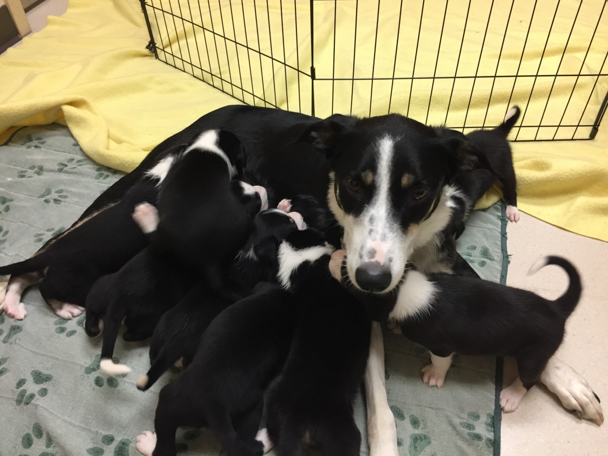 It was a big ask for a foster parent; it looked like Lani would give birth to about 10 puppies. Caring for a mom and large litter requires a lot of hard work and patience. Carol Christensen had fostered many large litters of puppies and agreed to take Lani. But, it would be a few days until she was back from vacation and able to pick up Lani. Everyone hoped Lani’s puppies would wait until they got to Carol’s house, but that didn’t happen. One by one, Lani’s puppies were born a few days after she arrived at OHS.