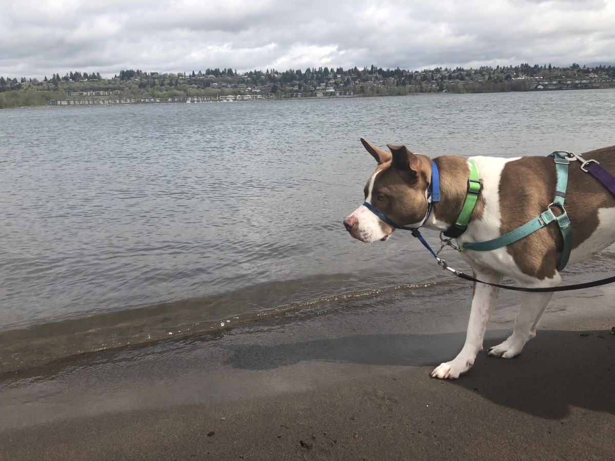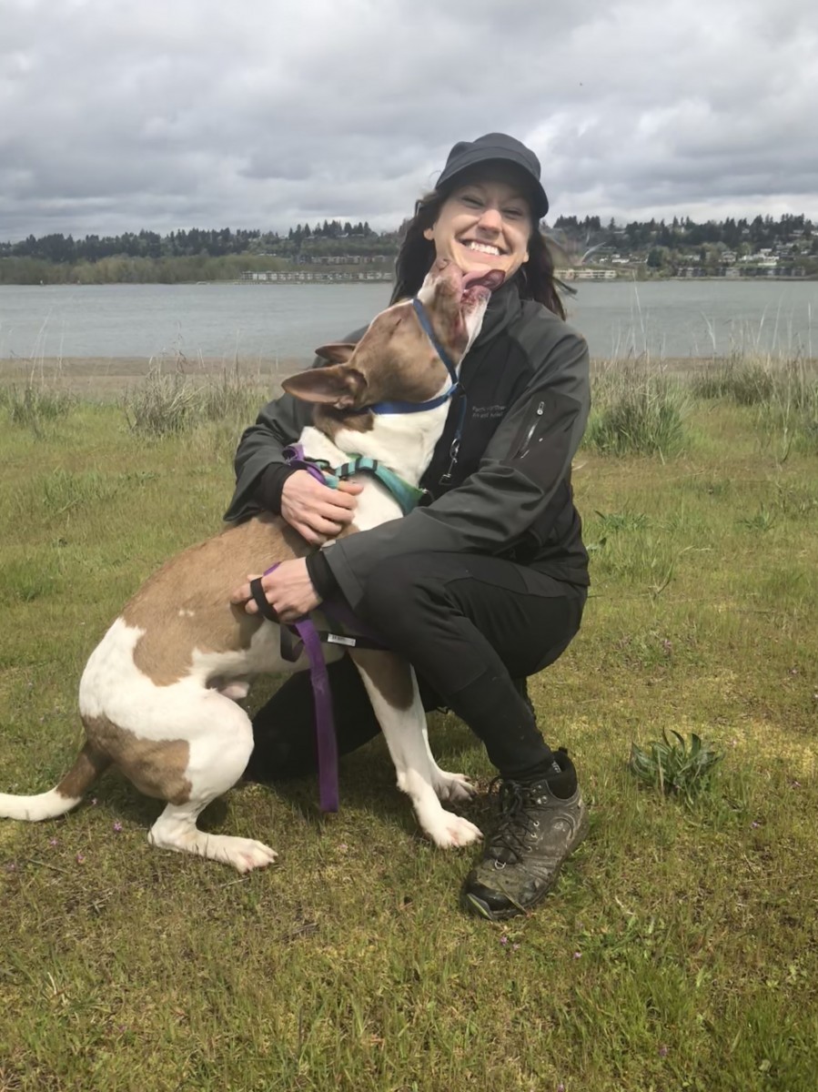 Giving Bumble an outlet for his energy was also extremely helpful. First, he joined the OHS running team, logging the miles with OHS volunteer John Franko on the Marine Drive path. Next, Bumble joined playgroups with other dogs. It was a delicate process to find the right playmates with similar energy. Jessica noticed a huge difference in his stress level after Bumble started participating in playgroup. “He got over the hurdle of being afraid of other dogs and realized that they could be fun playmates.”