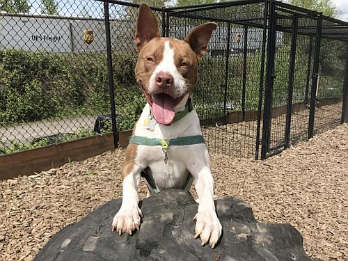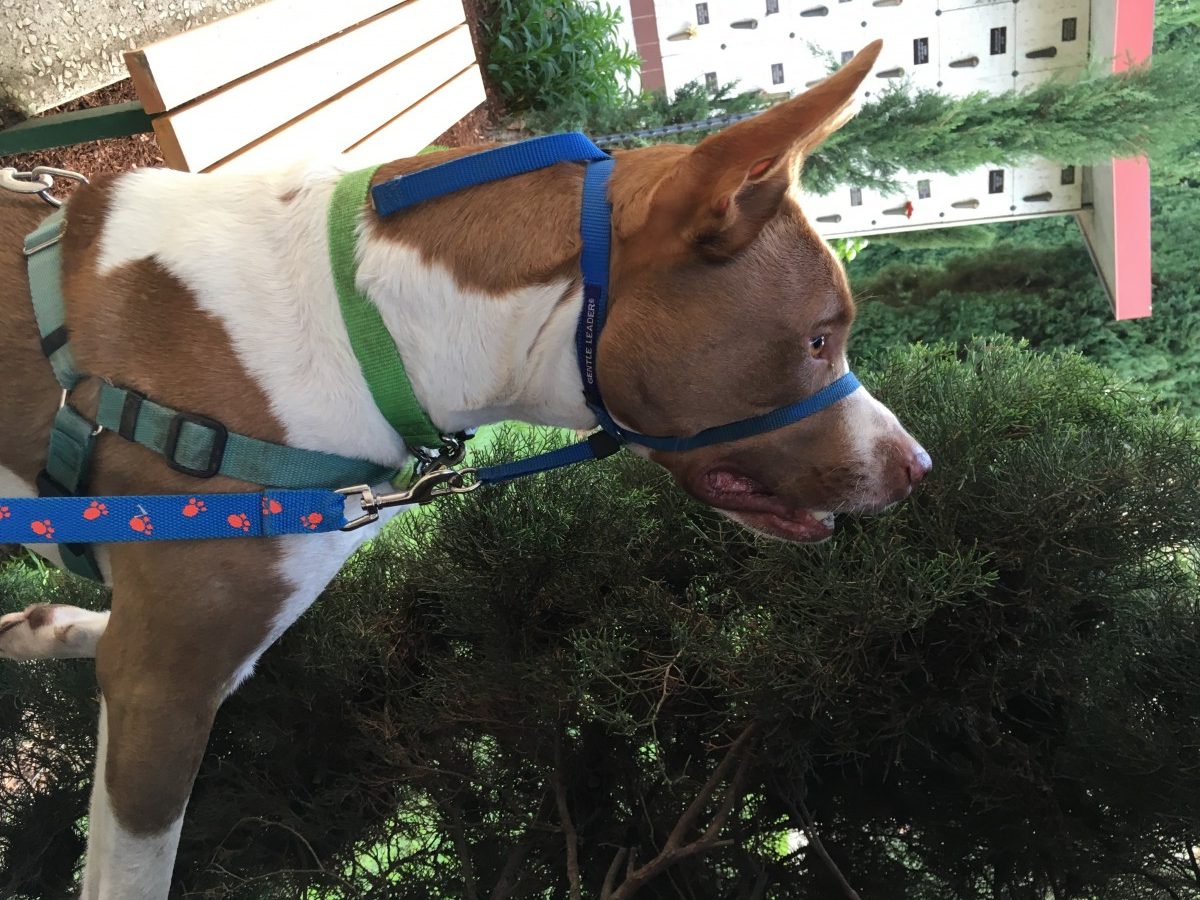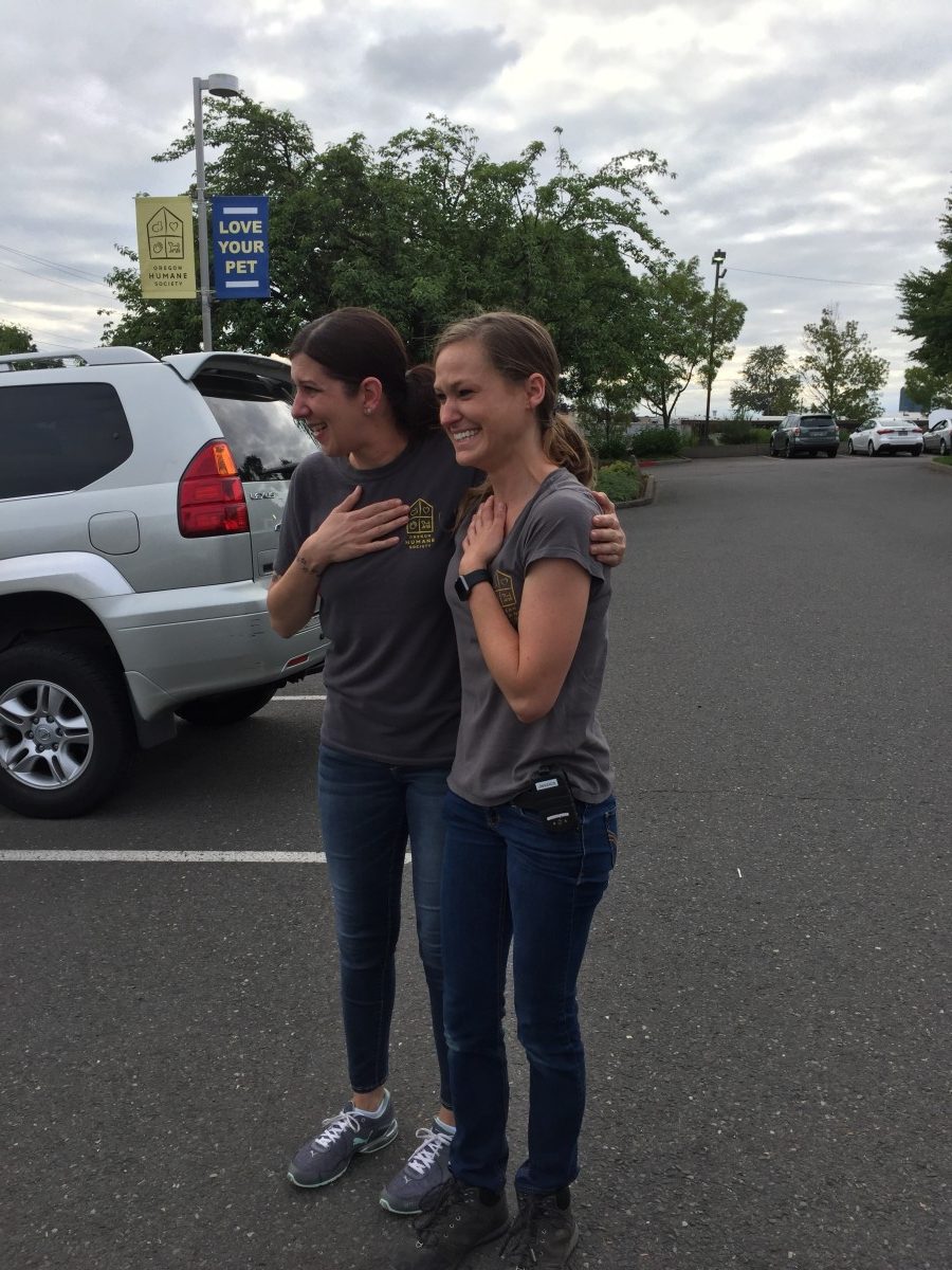 OHS has a number of resources and programs to help a dog succeed and Jessica put them all to work. First, she gathered her teammates from animal care and the behavior department to come up with a plan to help Bumble contain and channel his exuberance. “At first, getting his harness on was really hard,” recalls Jessica. “The minute I would walk into his kennel he would start jumping. It took a lot of going in and out of the kennel to get him to calm down.” Jessica also used canned food to help divert Bumble’s attention from other dogs when on walks. Patience and consistency were critical. Volunteer Margaret Spear came in hours before the shelter opened every morning to work with Bumble and would check in with Jessica to make sure they were all working on the same things with him.