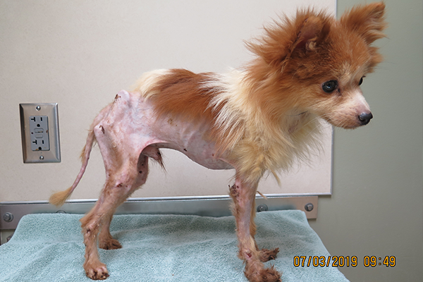 When two good Samaritans found Buster, the four-year-old Pomeranian was wasting away in a filthy crate beside a logging road in Clackamas County. He was emaciated and had fur missing from half his body. What little fur he had left was soiled and matted. Scabs and wounds covered his exposed skin. Weighing less than 5 pounds, he was so weak that he couldn’t walk.