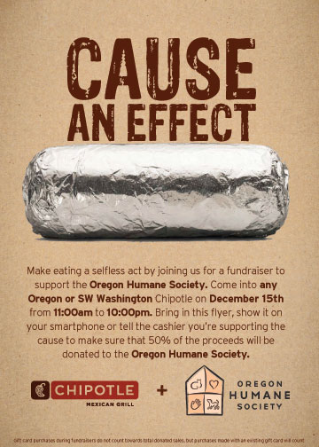 Chipotle: On Dec. 15, 2016, show this flyer (printed or on your smartphone) to the cashier at any Portland or SW Washington Chipotle restaurant or tell the cashier you’re supporting OHS. 50% of proceeds from this day will help the pets at OHS.