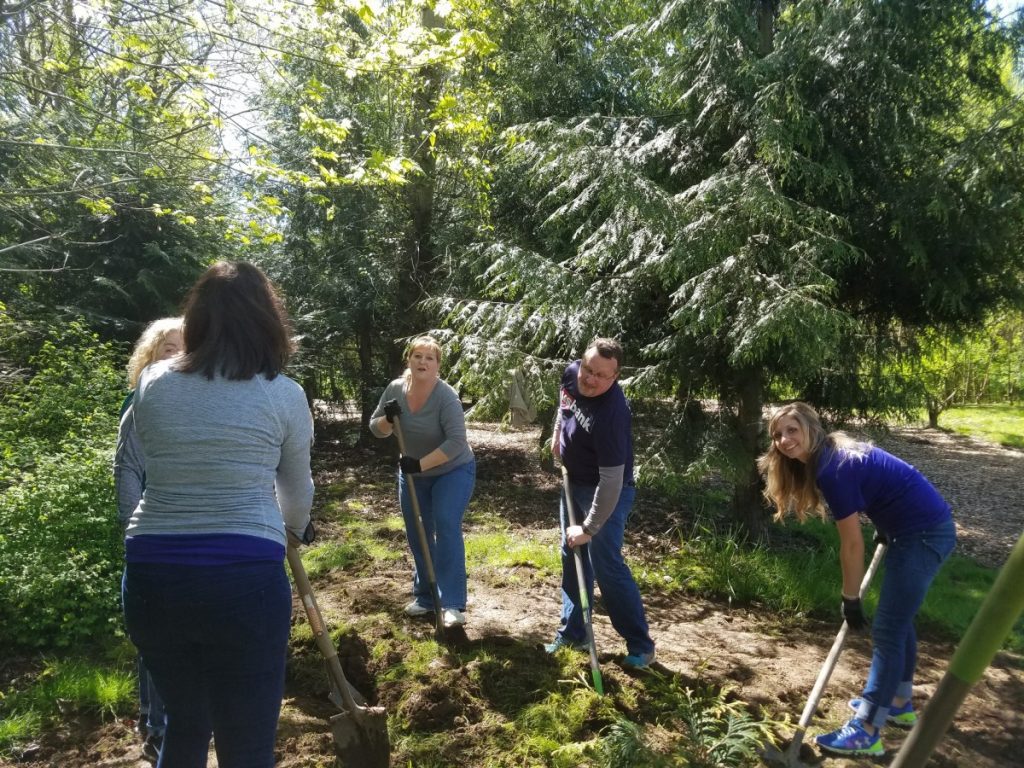 Teamwork! Demonstrated by the group from US Bank. - Planted eight salal on the steep slope by the path entrance