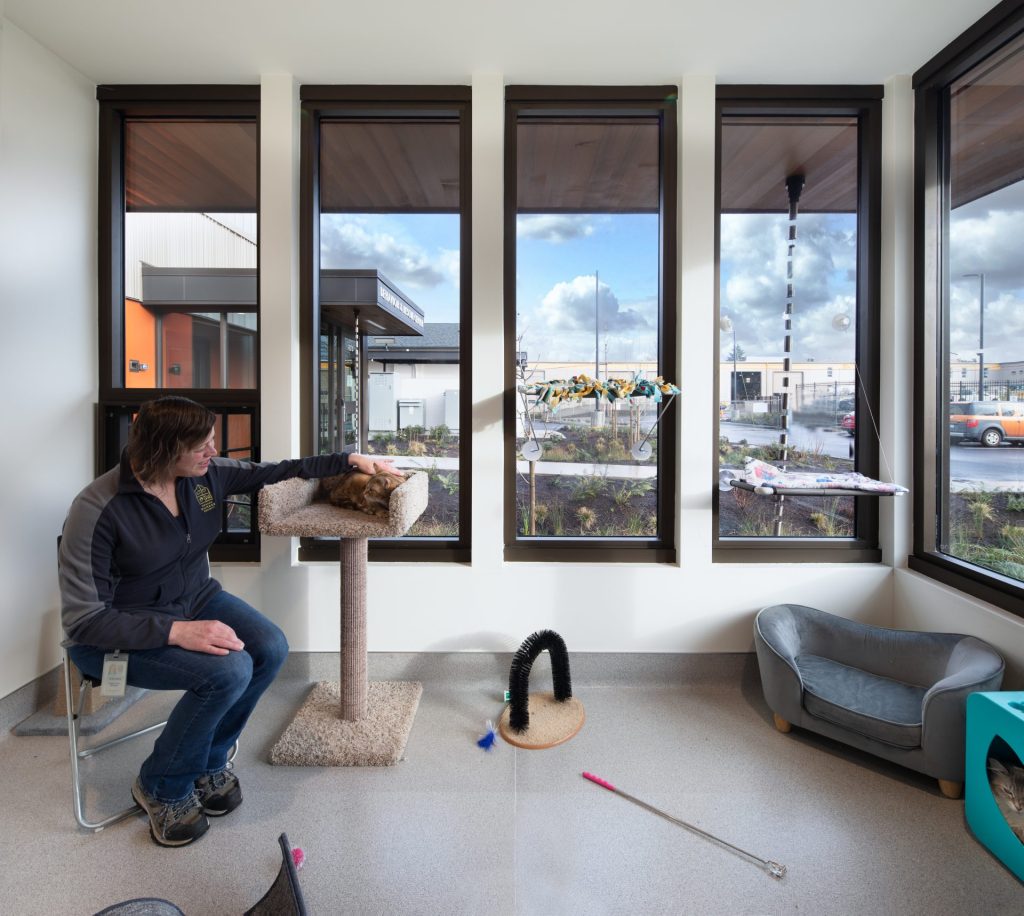 Cattery – The purpose-built Behavior & Rescue Center is where our animals in the Behavior Modification Program live. The cattery sunroom includes large windows for bird-watching and is a communal space for cats to cuddle and play with one another.