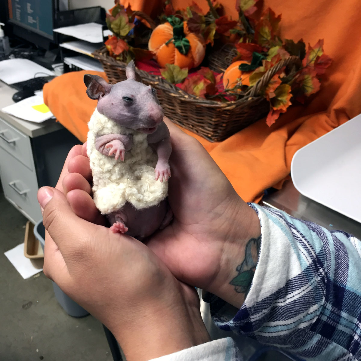 What do you do if you notice a hairless animal who seems to be chilly? In the case of Silky the hairless hamster, an OHS employee decided to crochet her a tiny sweater to help her stay warm. *Oct. 24 update below – Silky has been adopted!*