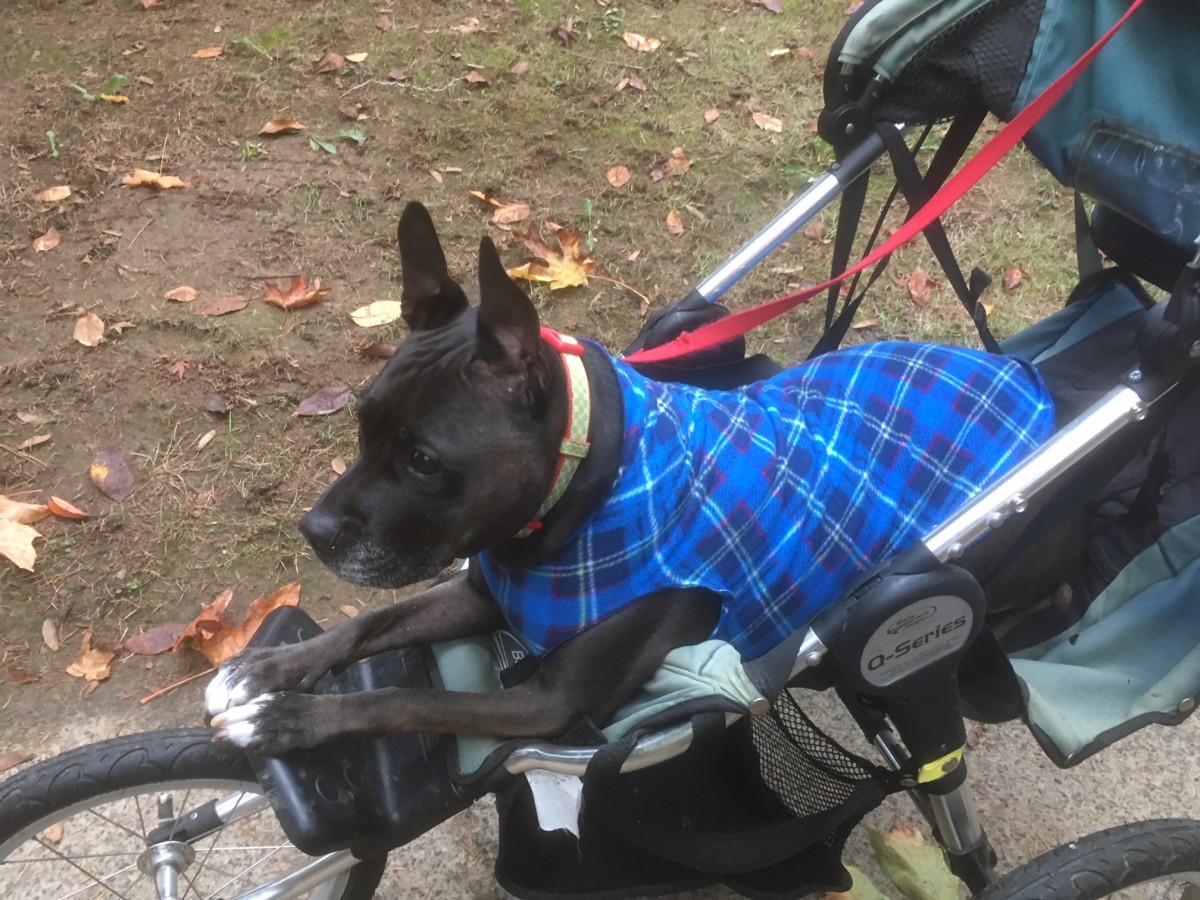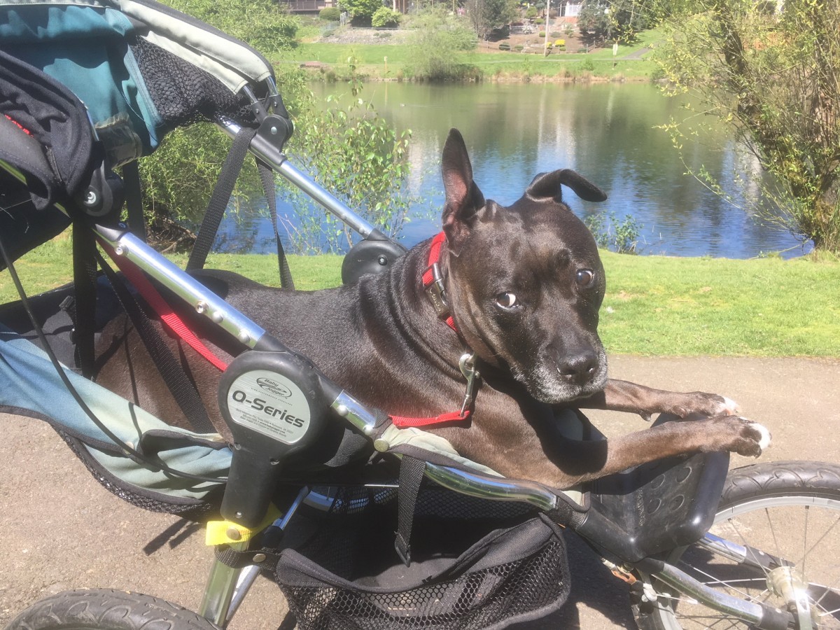 She is pretty much blind, very arthritic and stiff when walking. But are we not all when we get older? I live close to a park and took her down there several times only to have her lay down and not want to walk anymore. She was sore and done. Problem? She is 60 pounds and a lot to carry home! I did it numerous times before I came up with the idea of a stroller for her. I found a stroller on Craigslist for $30 and took it home to modify it to accommodate Rita. She LOVES it. We go to the park every day. I take her out of the stroller and let her do her business, then it’s back to her wheels of freedom to go home. Perfect for her to get out and about, and for me as well.