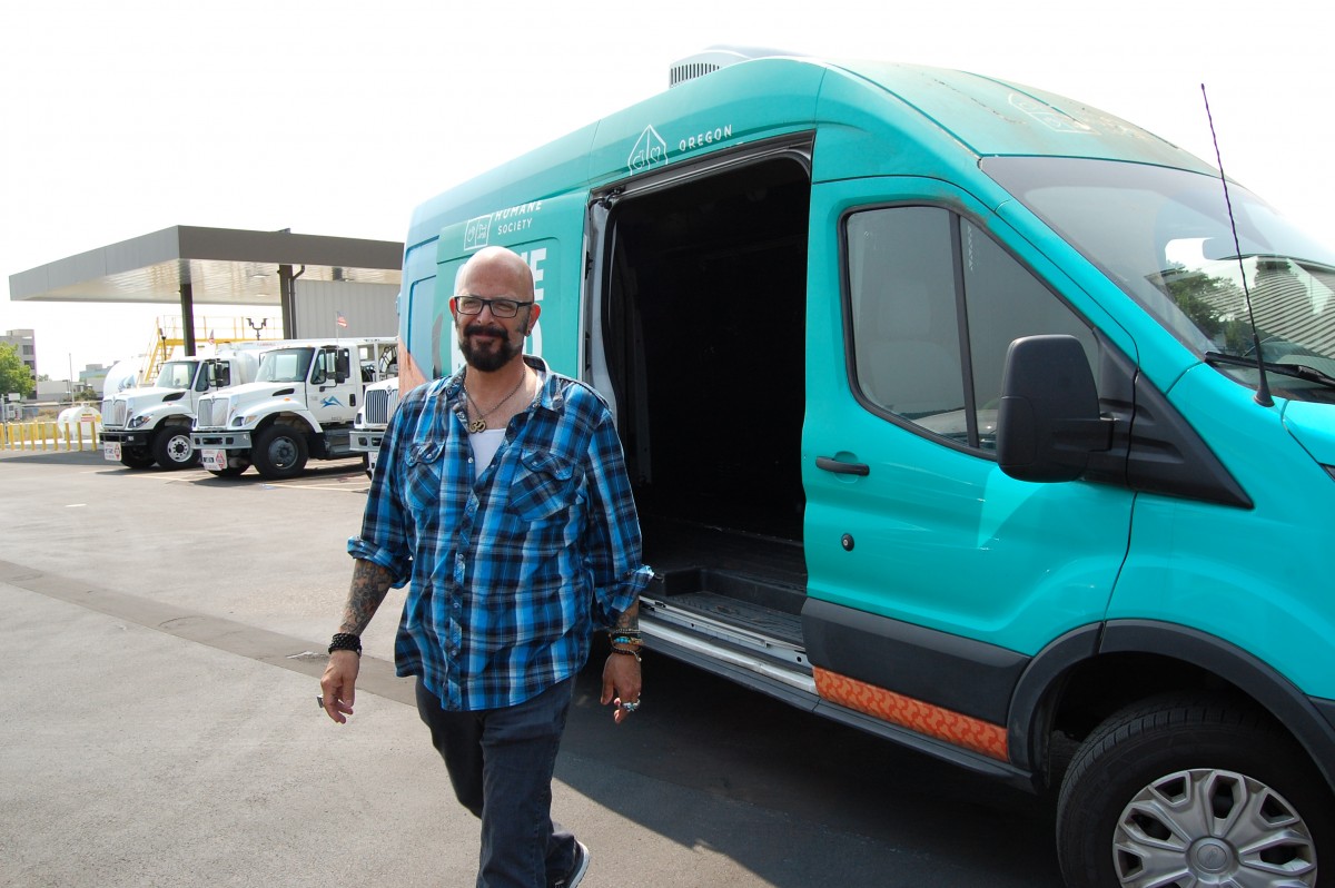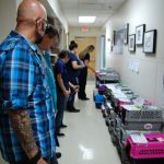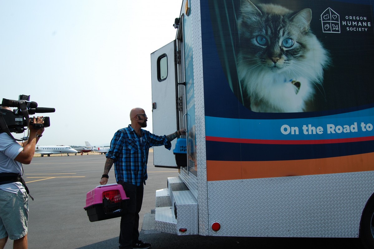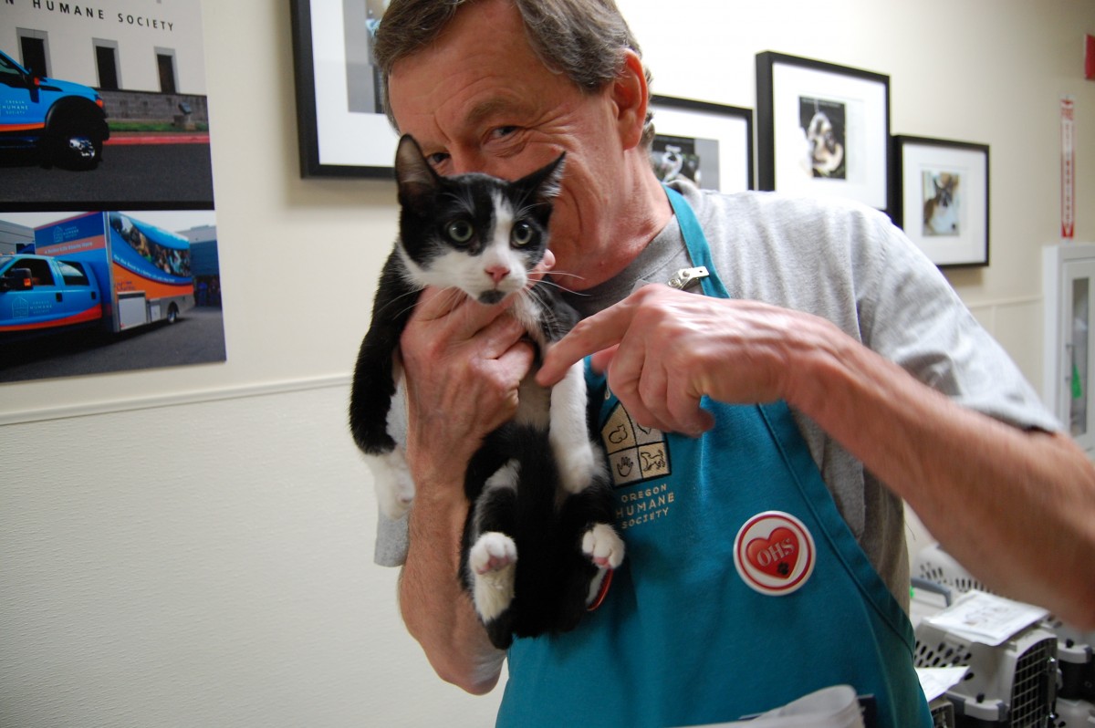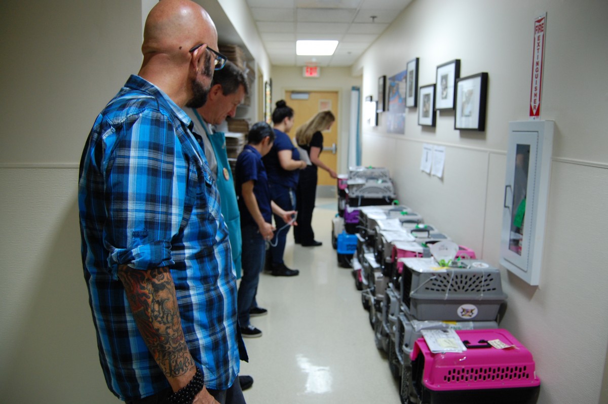 Back at the shelter, a group of volunteers met the OHS transport vehicle to unload and sort the new arrivals. The intake process took place in two different areas: Kittens who would be ready for adoption the next day in one screening room and the group that needed spayed / neuter surgery or were going to a foster home in another area. Volunteers helped move the kittens through the check-in process, prepared care packages for groups going to foster homes and cleaned dirty crates. Everyone was eager to help and have the chance to meet Jackson Galaxy.