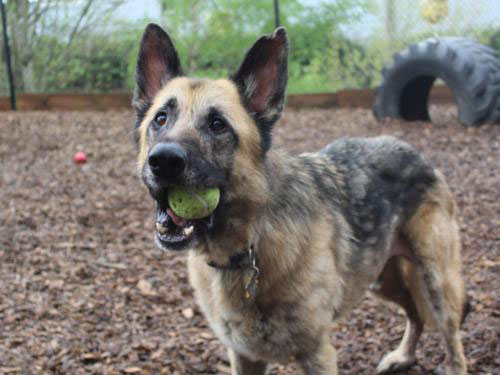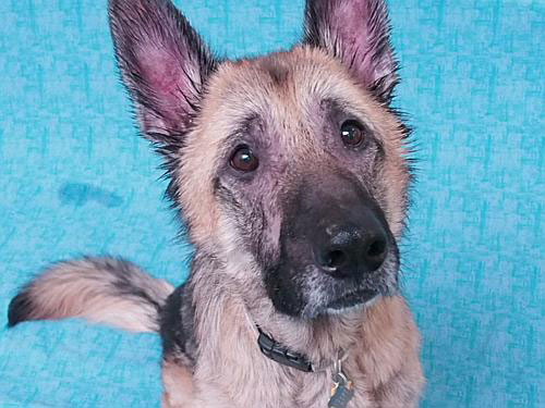 Long before I met him, Sancho was rescued by the Clackamas County Sheriff’s Office. He was emaciated, his skin was raw and inflamed, and he was missing much of his hair. Clackamas County Dog Services asked OHS to take Sancho because of the high level of medical care and behavioral assistance he needed.