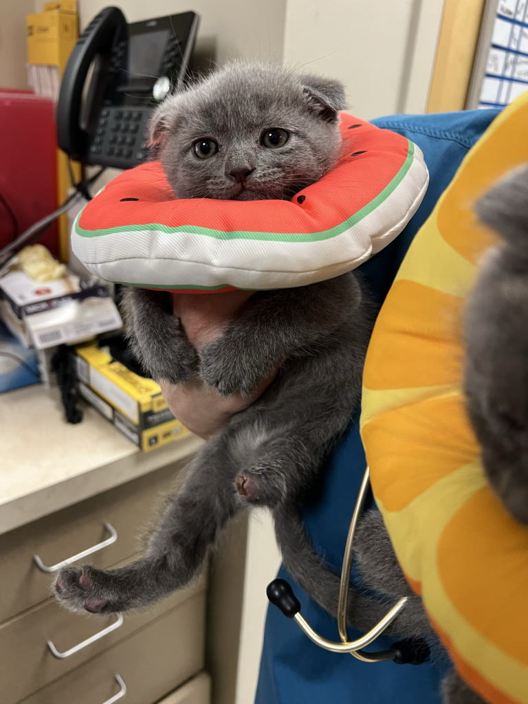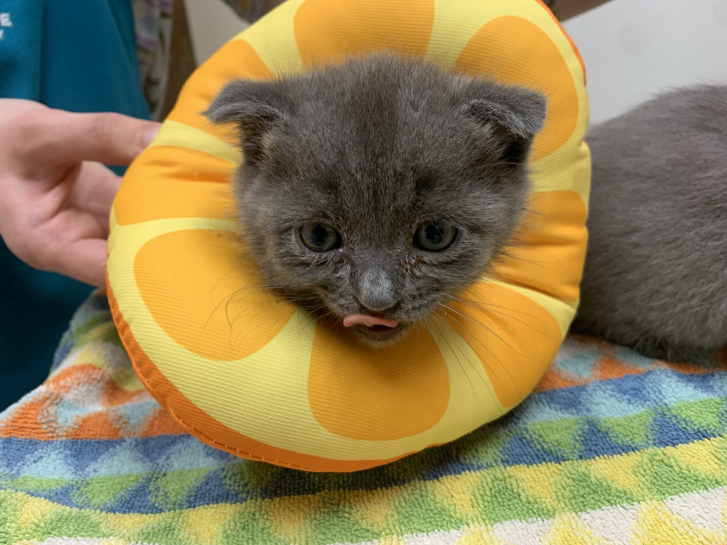 Upon examination, the OHS medical team found nearly identical injuries to Buck and Joey’s left hind legs—one limb on each kitten was severely damaged, with a bit of bone protruding. The injuries were likely sustained during birth, and they were so severe that it was determined the best course of action would be to amputate each young kitten’s injured leg.
