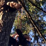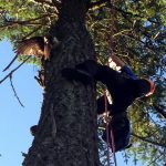 Finally having a space to work in, John and Emily got a line up into the tree and set up the climbing system. Reaching the hawk, John snapped a picture of it (it did not appear happy to see him). John scooted around to the other side of the tree so that he was working on its back side. Fortunately, Emily had remembered to bring a blanket, and once John had the hawk’s head covered and wings folded in, the hawk relaxed and John was able to figure out what was going on.
