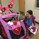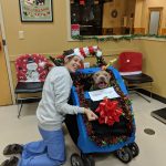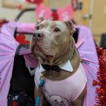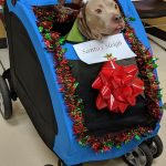 For Christmas, Tamara decorated the stroller as “Santo’s Sleigh” and went around the shelter delighting her co-workers and passing out candy canes. Santo’s visit was especially welcome during the busy holiday season, when shelter staff are working extra hard. During Halloween, Tamara and Santo dressed in matching costumes and once again brought smiles throughout the shelter.