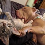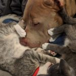 Costumes and strollers aside, Santo has taken on the important role of big brother to Tamara’s foster kittens. He loves to snuggle with them and frequently tolerates kitten antics on his head. The pair of little felines have also captured Tamara’s heart and recently found their forever home with Santo, Tamara and her husband.