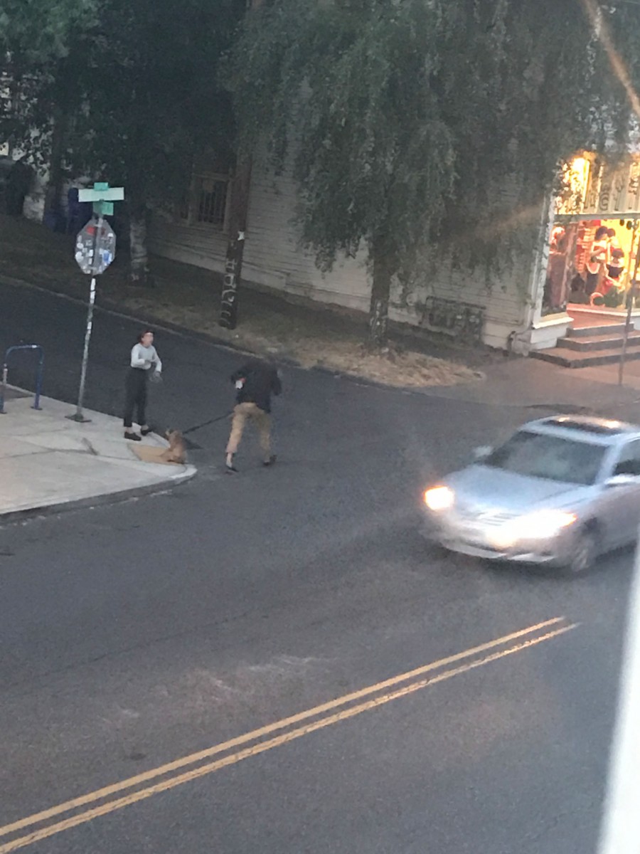 A witness reported that both the man and the woman yanked the dog up by the leash and that at one point the dog was knocked off balance and fell into the street.
