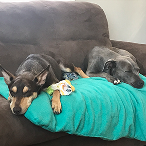 OHS trainers determined that Smidge needed a foster home. Tyler, an OHS staff member, brought Smidge home and introduced her to his dog Pork Chop, a sweet, playful pitbull who had helped other anxious dogs. Smidge slowly transformed into a playful and happy dog and found the perfect forever home.