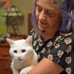 In February, Swan was placed in a foster home with Stacey Schroeder and her family. They didn’t have other pets and their home provided a quiet space where Swan could learn to be a cat. As a nurse, Stacey understood that progress would be measured in small increments. “At first, I could feel every vertebrae, says Stacey. “Now, seven months later, I can’t at all.”